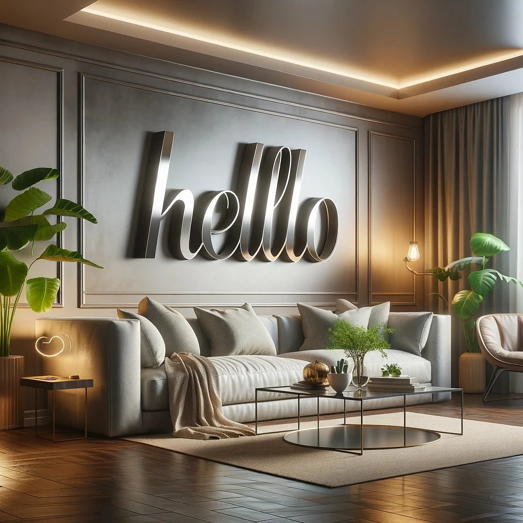 A modern, stylish living room with a large, laser-cut metallic text 'Hello' mounted on the wall as a decorative piece. The 'Hello' text is artistically designed, with smooth edges and a metallic sheen, reflecting light and adding a contemporary feel to the room. The living room is elegantly furnished with a comfortable sofa, a coffee table, indoor plants, and ambient lighting, creating a cozy and welcoming atmosphere. The wall color is neutral, making the metallic 'Hello' stand out as a focal point.