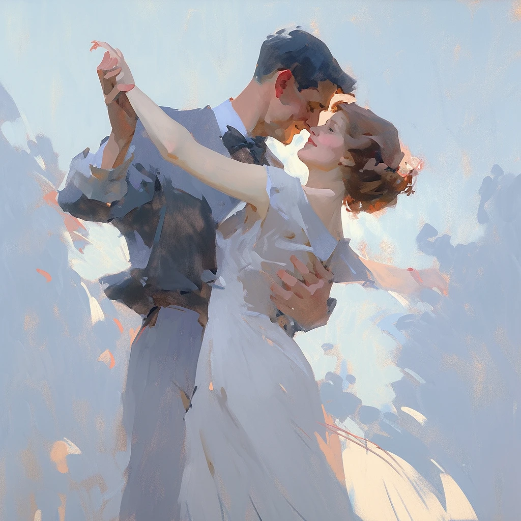 A blissful couple, dancing with joy, in the style of Arthur Streeton, a romantic palette, with soft lighting, rendered in a whimsical style, clean and slate gray background::2 --ar 1:1 --niji 5