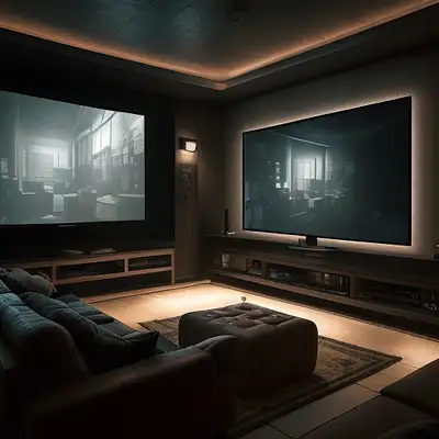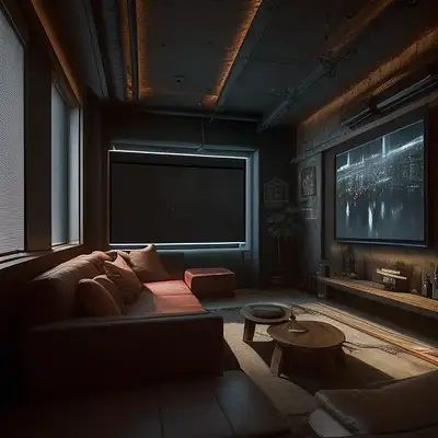 Photo of a ultra realistic architectural interior gaming and bar room in a house , warm lights, wall lights, cozy couch, wabi sabi style, cinematic lighting, battered, low angle, 41 tv on a wall, projector, trending on artstation, 4k, hyper realistic, focused, extreme details, 5, cinematic, masterpiece, 130 square feet area, neutral warm colors, birch wood, small, bar area, 3 stools, behance, vray tracing, vray, product design photography, styled and chic decorations