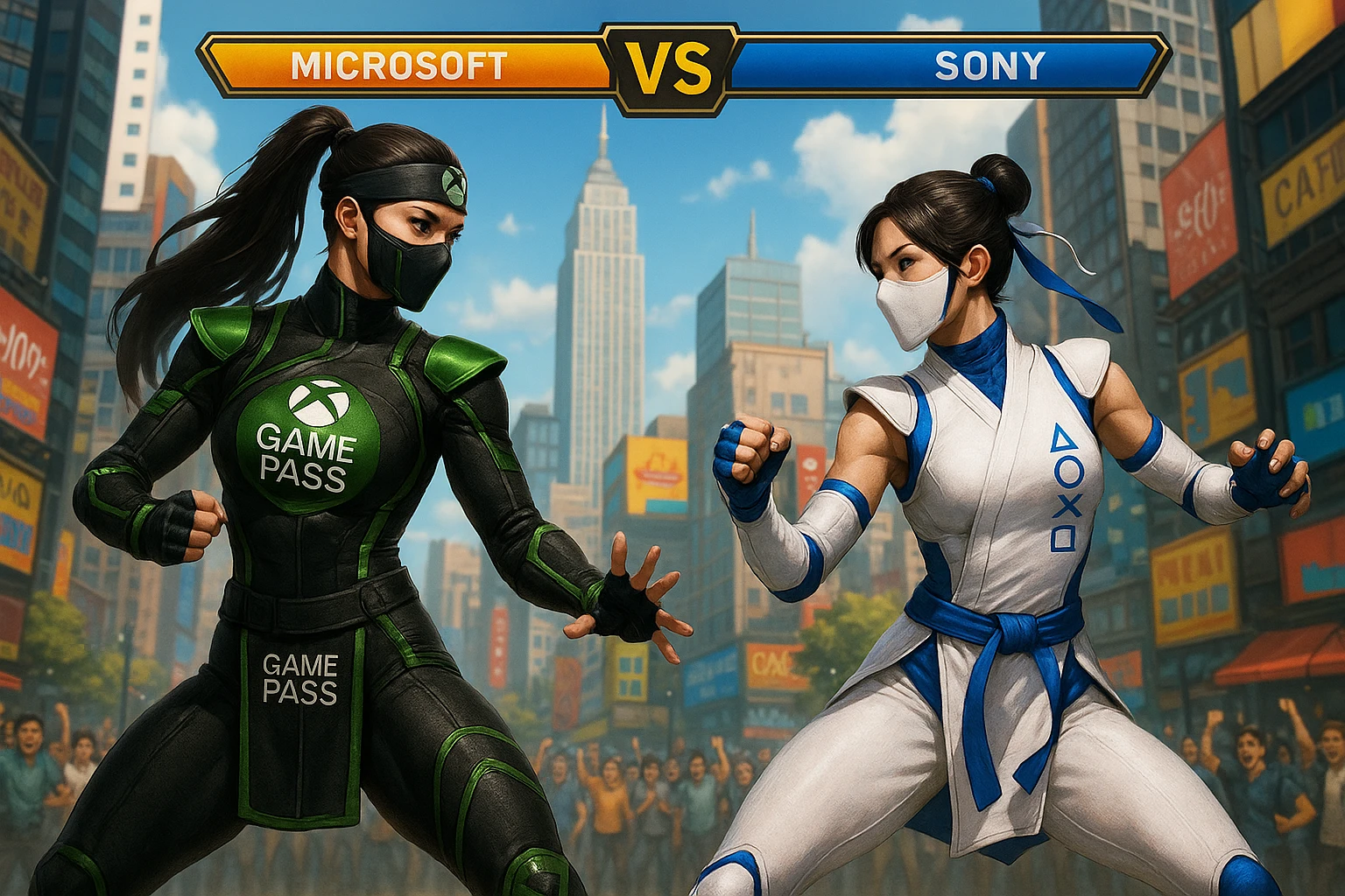 A vibrant, cinematic fighting game scene inspired by Mortal Kombat, set in broad daylight. On the left, a tall, athletic female fighter representing Microsoft stands in a confident combat pose. She wears sleek black-and-green ninja armor with Xbox-inspired details and bold Game Pass logos. On the right, her opponent is a graceful female fighter representing Sony, in a futuristic white-and-blue ninja outfit inspired by the PS5 design, decorated with PlayStation button symbols. She also stands ready in a dynamic combat pose. Above them, glowing health bars labeled “Microsoft” and “Sony” with “VS” in the center. The background shows a lively cityscape in daylight, with skyscrapers, colorful billboards, and a cheerful crowd gathered to watch the fight. The mood is energetic and positive, with a festival-like atmosphere. Full-body shot, ultra-detailed, hyper-realistic, 4K.