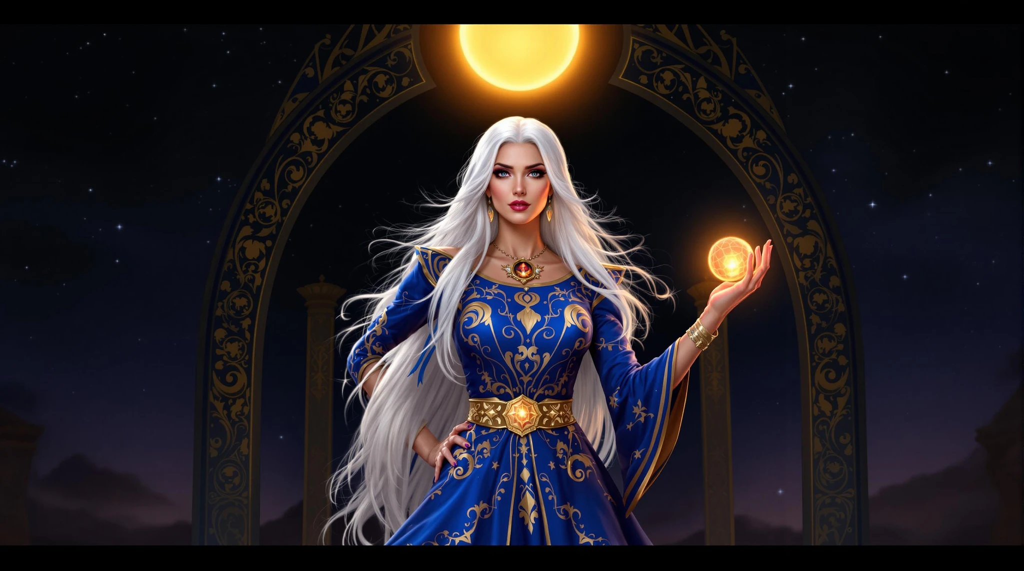 The image depicts a woman with long, flowing white hair and a blue dress adorned with intricate gold designs. She wears a gold belt around her waist and holds a glowing orange orb in her hand. The background is a dark, starry night sky with a large, ornate archway behind her. The archway is decorated with gold filigree and features a large, glowing orange circle at its center. The overall effect is one of mysticism and wonder, as if the woman is a powerful sorceress or goddess.