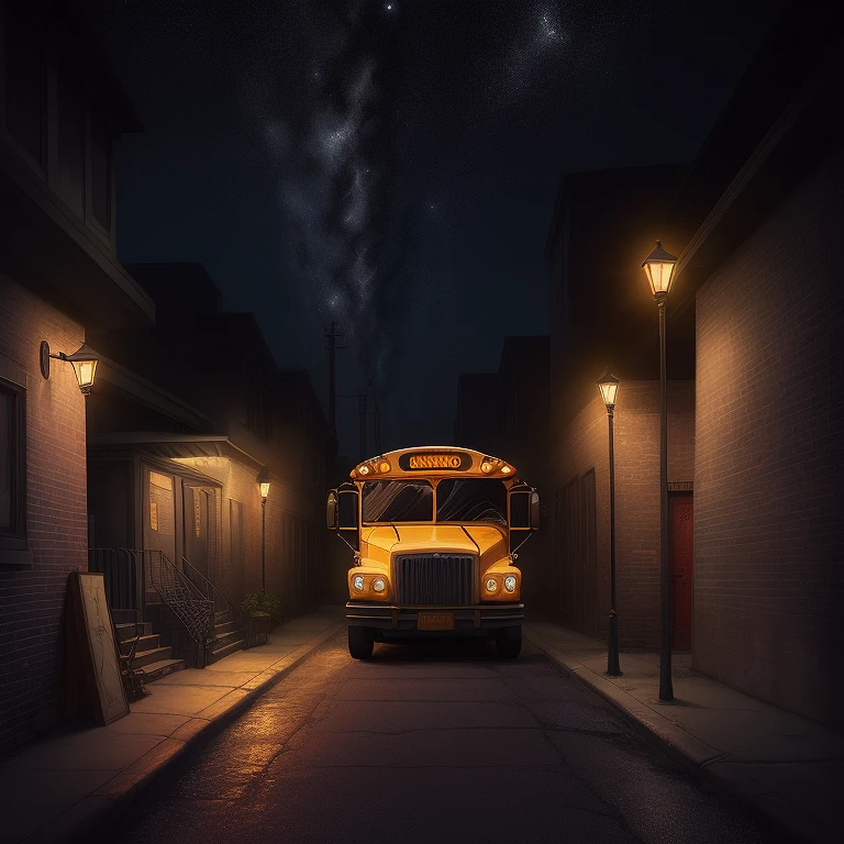 Art by Kajenna, school bus in an alley, night time, intricate details, highly detailed, digital painting, stunning, textures, breathtaking beauty, pure perfection, divine presence