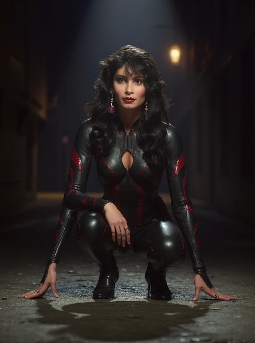 full body image, extreme bird's eye view down shot, dramatic lighting, under a spotlight, in a big city alley, wearing a shiny, skin tight, black leather bodysuit with red stripes, crouching in 3/4 front, superhero type pose