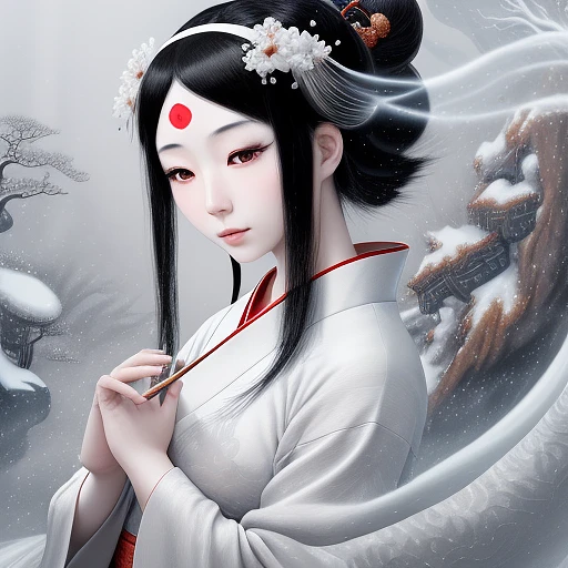 a Japanese woman with black hair living in a cave, a celestial being, wears white Daofu, has a headband, a Chinese dragon with him, in the style of Japanese Ukiyo-e, beautiful scenery of a Chinese fairy tale, misty with white snow covering the ground, graceful figures --ar 4:5 --s 1280 --v 6. 0