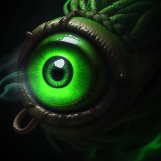 Eyeball, glowing green, close up, center shot, leather braided necklace, eyeball glowing a green smoke center. masterpiece, concept art, mid shot, dynamic, centered, splash art, mythical majestic, solo, focus, fiery effect, detailed unreal engine, 8k, super detail, depth of field, studio lighting, (epic composition, epic proportion) , Award Winning, realistic light, wide angle, kinkfolk photography, A+D architecture