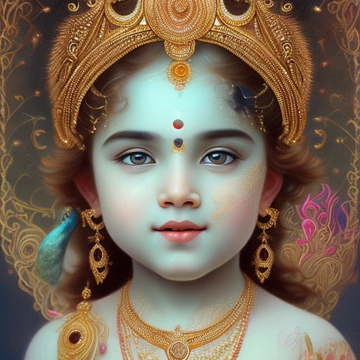 Ultra realistic photo, young Krishna , cute smile, with peacock feather in crown, intricate, elegant, highly detailed, digital painting, smooth, sharp focus, style by Roberto Ferris and alphonse mucha