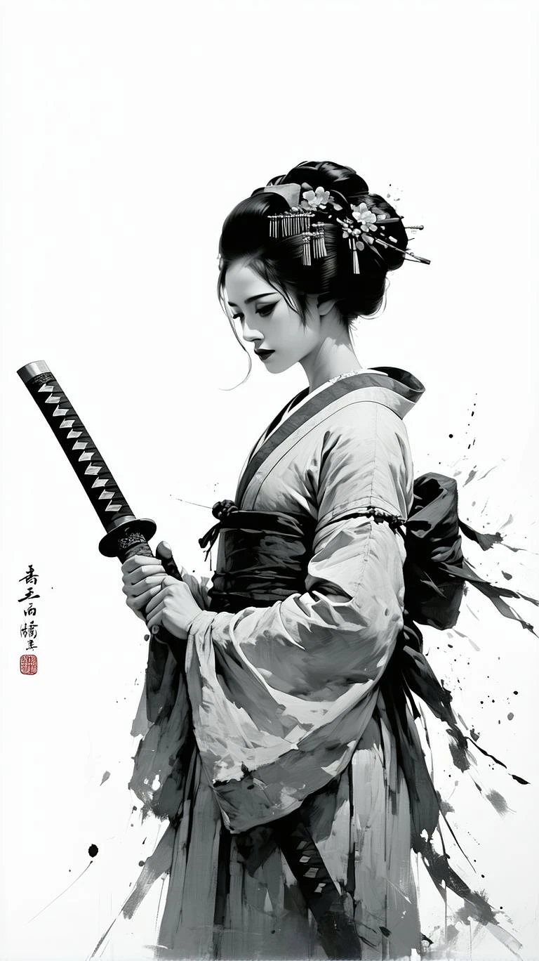 beautiful geisha holding a sword, in the style of a traditional Japanese artist, thick consistent lines, minimal detail, black and white, no shading or tones --ar 63:128 --personalize 2gwf1qc --stylize 750 --v 6. 1