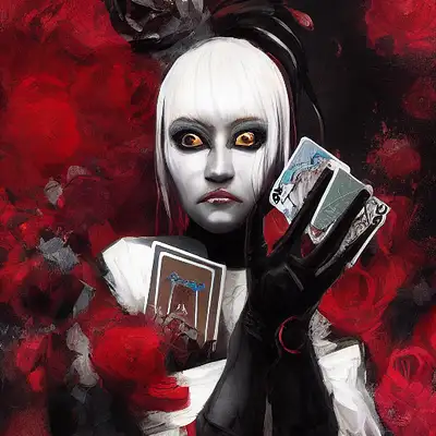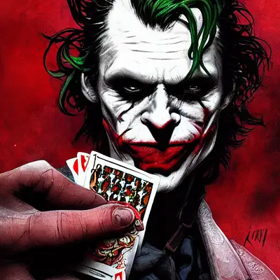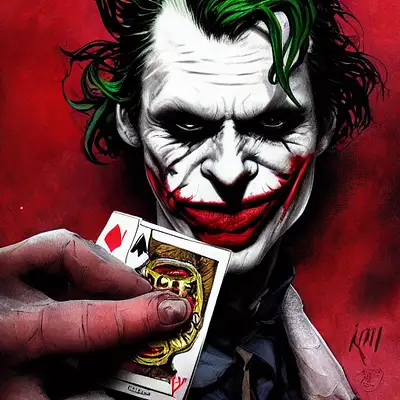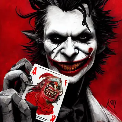 highly detailed portrait of Joker Face, Fake smile, holding the cards, by Dustin Nguyen, Akihiko Yoshida, Greg Tocchini, Greg Rutkowski, Cliff Chiang, 8k resolution, Dishonored inspired, bravely default inspired, vibrant but dreary red, black and white color scheme! ! ! , epic extreme long shot, dark mood and strong backlighting, volumetric lights, smoke volutes, artstation HQ, unreal engine, octane renderer, HQ, 8K