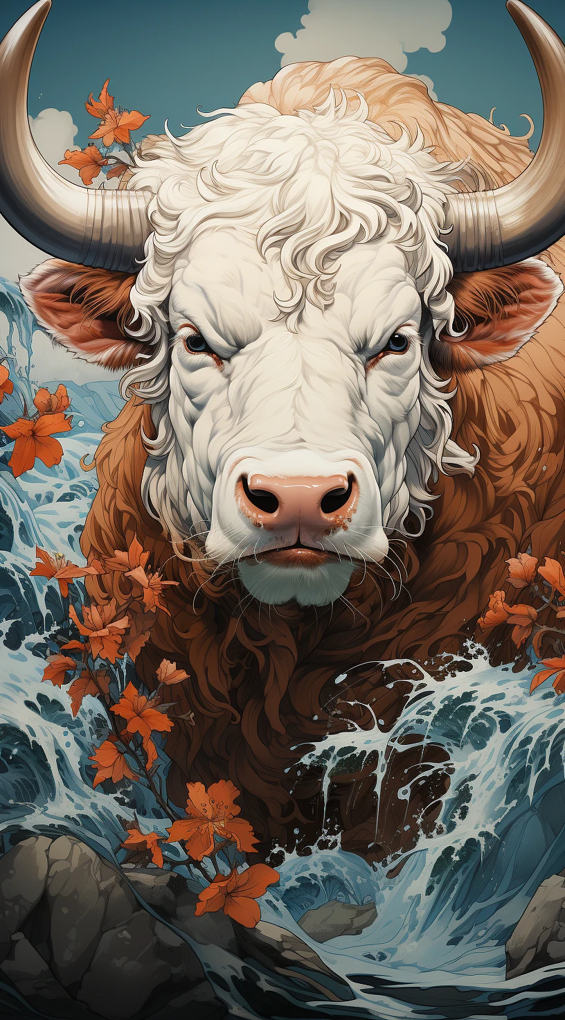 a cattle in the waves art print, in the style of kōji morimoto, neo-traditional japanese, john blanche, murals and wall drawings, tyler walpole, intense close-ups, absurdist --ar 71:128 --stylize 750 --v 5. 2