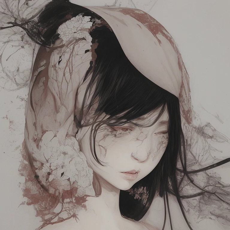 a single Woman crying blood, artwork by Takato Yamamoto and Chika Yamada, very detailed, minimalistic