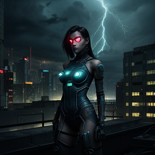 Digital artwork, concept art, a cyberpunk girl with Prompt Hero text on her chest, standing on rooftop with a dark dystopian city in the background, dynamic pose, fierce, comics style, extremely intricate, extremely detailed, ominous lighting, dramatic lighting, dark stormy night, shot with Hasselblad, long exposure