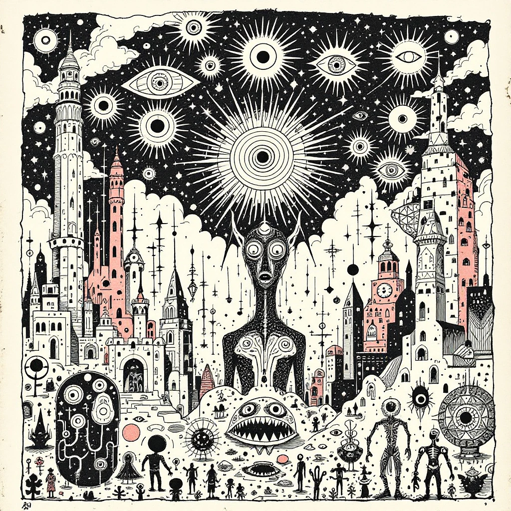 a drawing of an alien character surrounded by symbols and shapes, ink on old paper, surrealism, multiple eyes in the sky with suns, strange architecture, strange creatures, vintage poster art style, whimsical --ar 36:49 --stylize 750