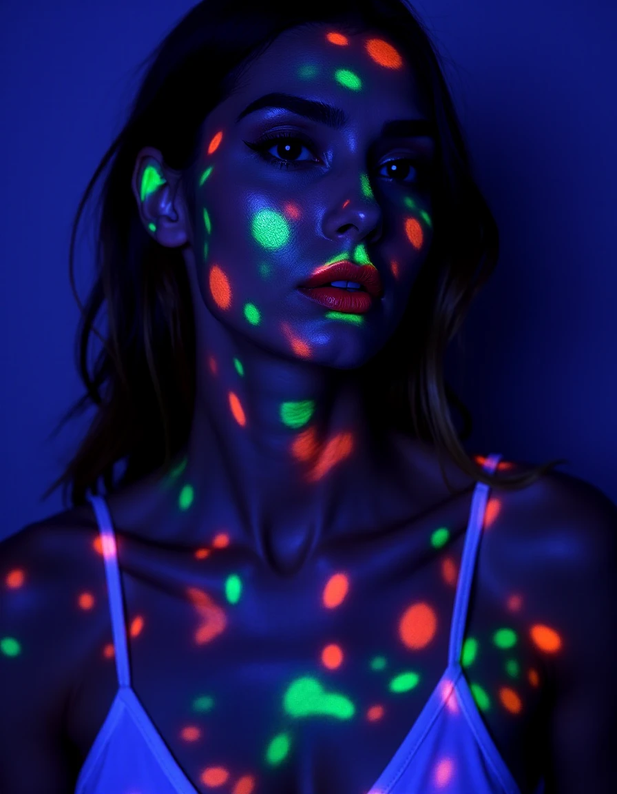 woman portrait, UV lighting, black light, glowing effects, ultraviolet, UV light, ultra-violet light, fluorescence, phosphorescence, glowing, radiant, luminous, glow