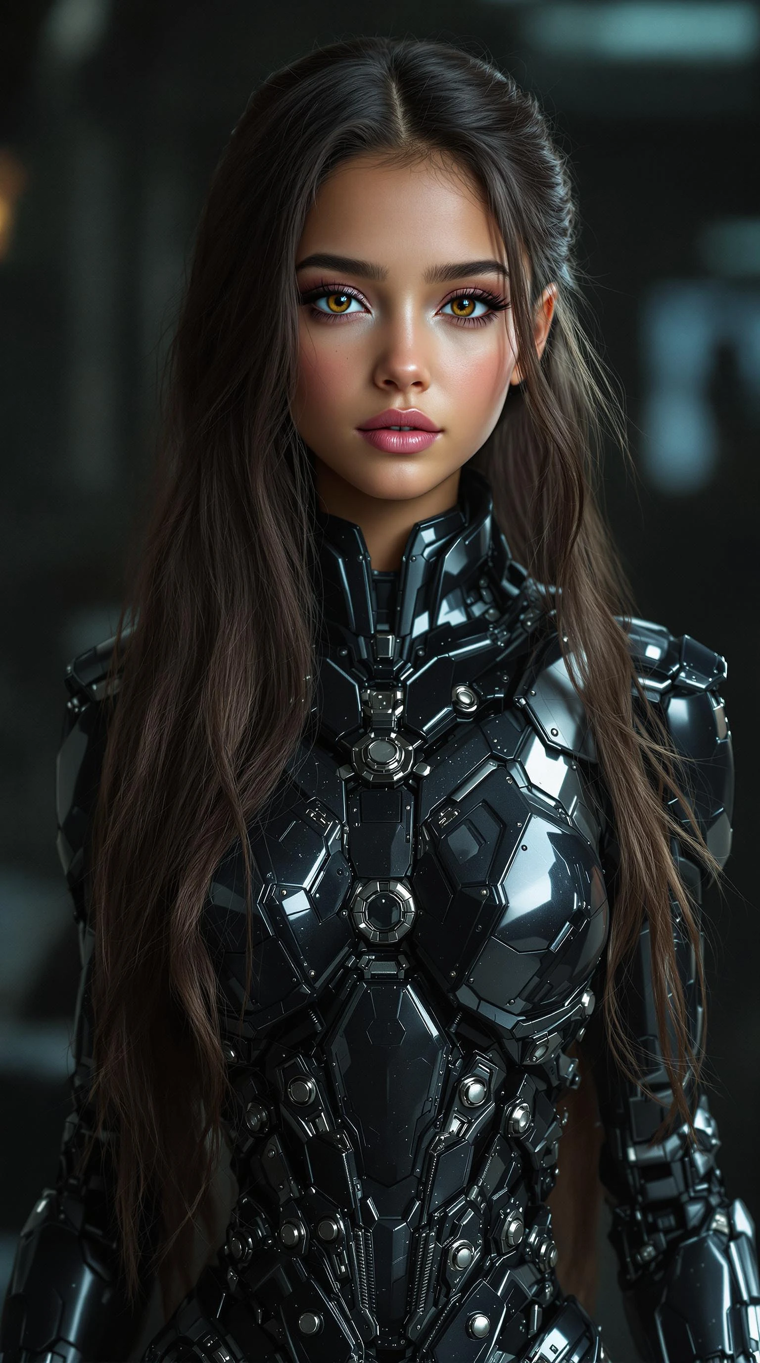 professional photo of a exceptionally of the most beautiful Colombian girl in the world, eleven year old Shakira (futuristic) , (masterpiece) , (realistic) , (perfect anatomy) , (Full body) , head to toe, flawless skin large beautiful brilliant Forest Tea brown eyes, black eye liner, light pink blush, dark purple eye shadows, small dimples in cheeks very long brown hair, futuristic background cyborg warrior in a heavily protected volumetric mechanical exoskeleton stands in a dynamic curved pose, dnd art, whimsical dark cyberpunk, sci-fi, mechanized precision, (4k,high res) , ultra-detailed, photo-realistic, full image view, full body view, front view