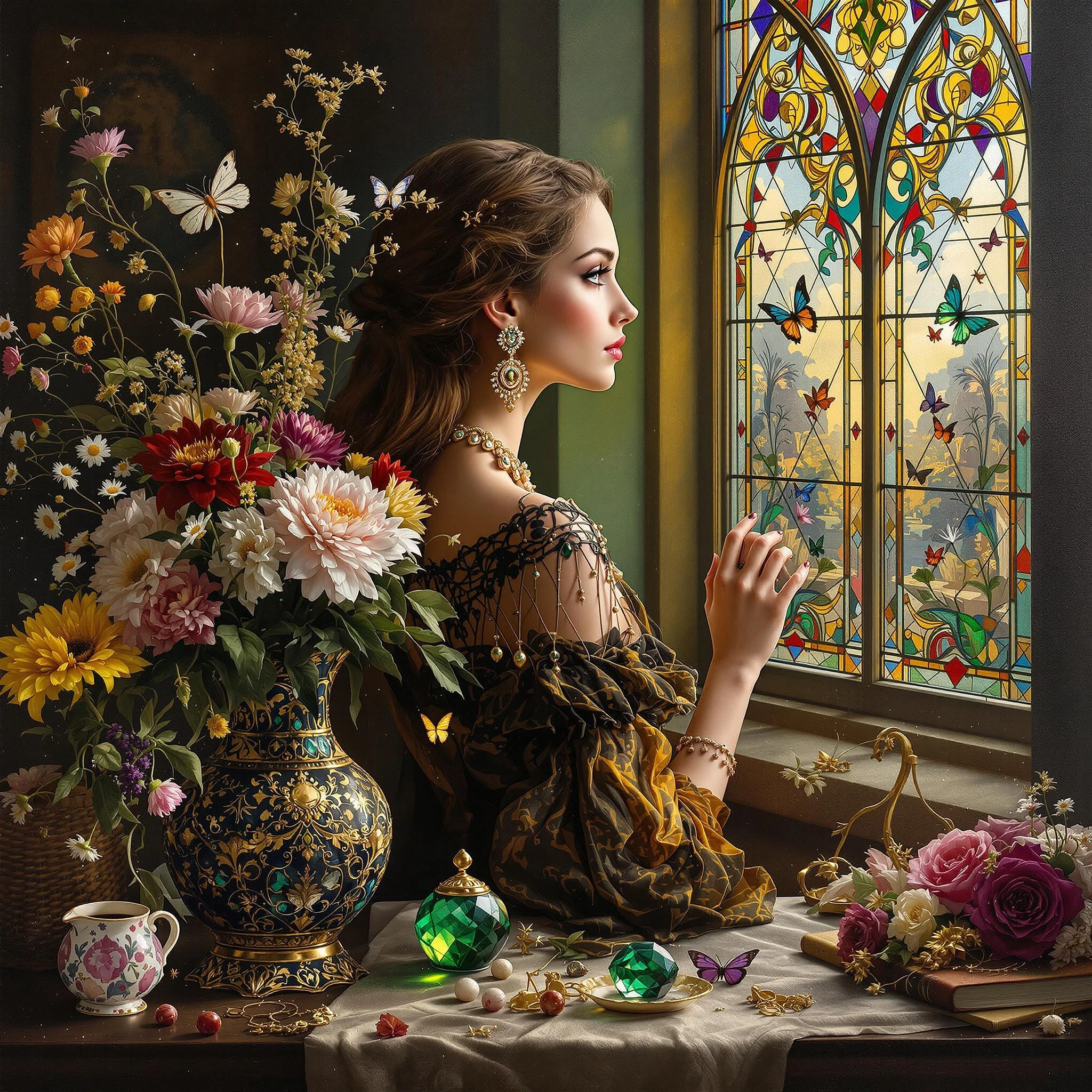 It's a still life oil painting and a now late afternoon. In the style of the Dutch Masters, an oil painting depicting a young noblewoman with long flowing hair and elaborate earrings and a necklace made of gold, diamonds, and emeralds, gazing out a stained glass window, with an intricate vase of various flowers, some with butterflies on them by her side. a paper weight made from an emerald, and reflecting across the room. A fireplace behind her sends out mesmerising light. Highly detailed, 8d, surreal, psychedelic and with a touch of Vermeer.