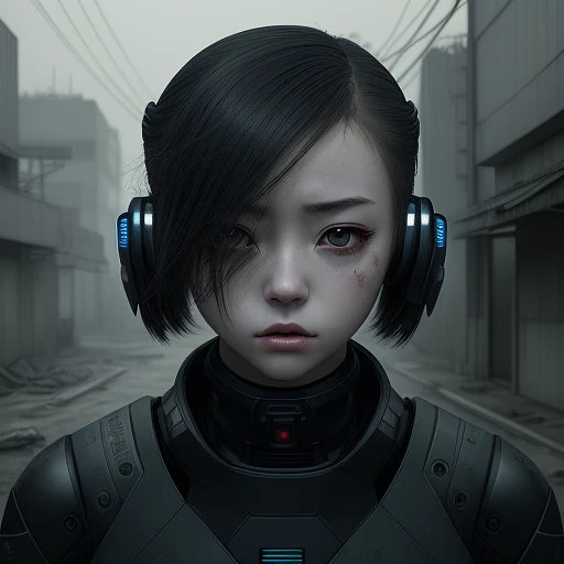 create image of woman, face perfect expressive teenager, style Japanese female android in dystopian attire on a desolate street, overcast, ruins, cinematic, 32k, --ar 9:16 --niji 5 --style expressive