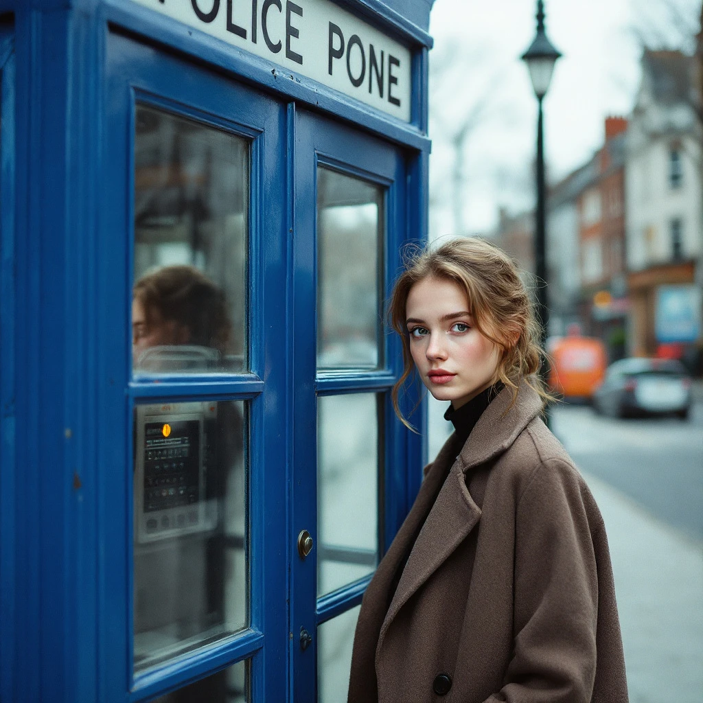 Dr. WHO , Jodie Auckland Whittaker, pertty young female, she is 30year old, she is stand next totelephone booth , 60s british police telephone booth, the color is bule and door is open, the background is in the street. and photograph taken with a 25mm lens in the style of Derin. --ar 45:64 --v 5. 2