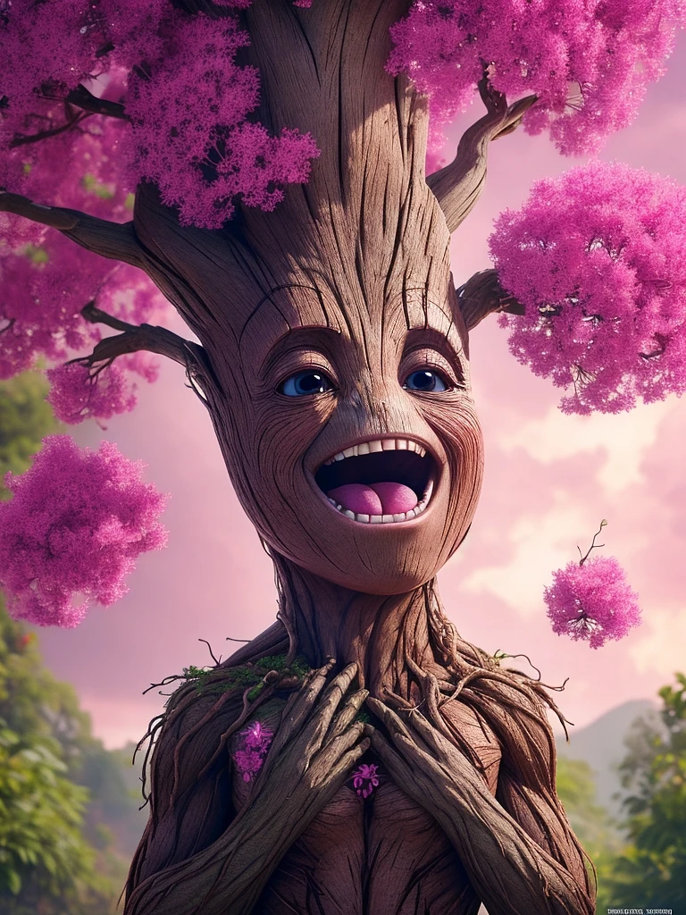 the happy groot, pink, marvel, nature background, beautiful, cinematic, hper detalic, 8k