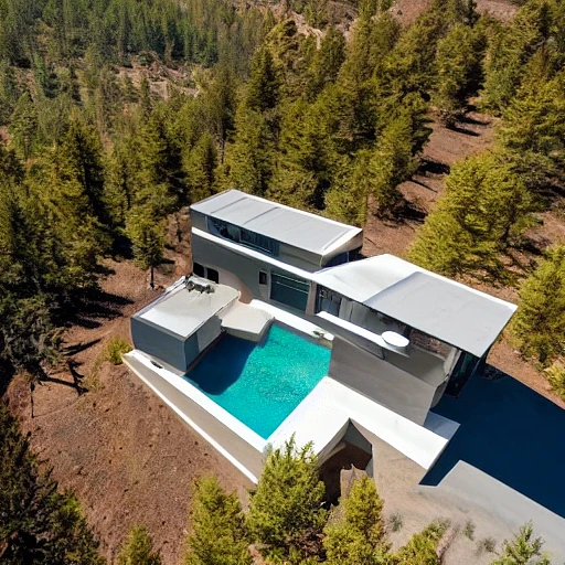 Drone view of a modern, minimalist dream home nestled in the mountains, with clean lines and a neutral color palette, with floor-to-ceiling windows offering stunning panoramic views of the surrounding wilderness,