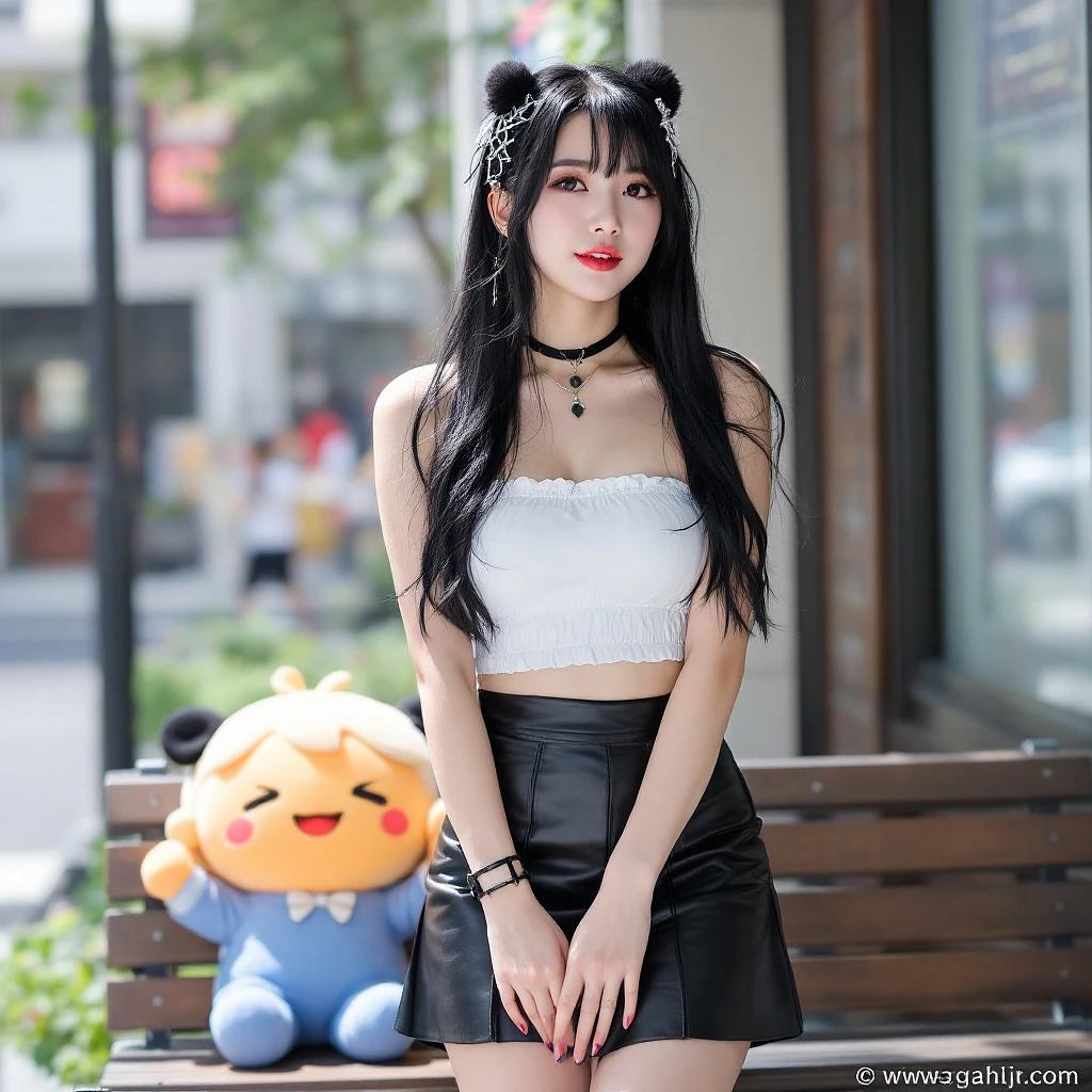 a woman, outdoors, city, tokyo, street view, building city, standing, arms between legs, black hair, long hair, hair ornament, wearing a white bandeau, short leather skirt. The outfit conveys a playful and gothic outfit. In the background, there is a bright and airy setting with some greenery and a cheerful action figure character plush toy on the bench, adding a fun and cozy atmosphere to the scene.