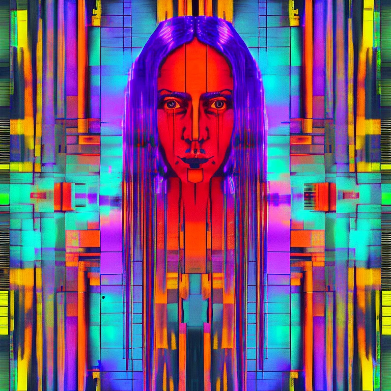 Abstract bioluminescent portrait of a determined beautiful woman with long iridescent hair, gritty purple vibrant cybernetics, digital UI, abstract blocks, glitch art, hacking effects, glitch effects, digital tech effects, chromatic, color blocking! , octane, object-centered, oil on canvas, cyberpunk, symmetrical, Red, concept art, abstract, trending on art station