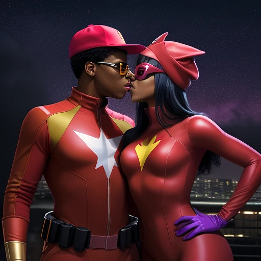 JOHN BOYEGA IN A RED SPANDEX SUIT, WITH YELLOW GLOVES AND BOOTS , SUNGLASSES AND RED BASEBALL HAT, WHO IS KISSING AALIYAH IN A PURPLE AND PINK CATWOMAN COSTUME, UNDER THE MIDNIGHT SKY WITH SHOOTING STARS.