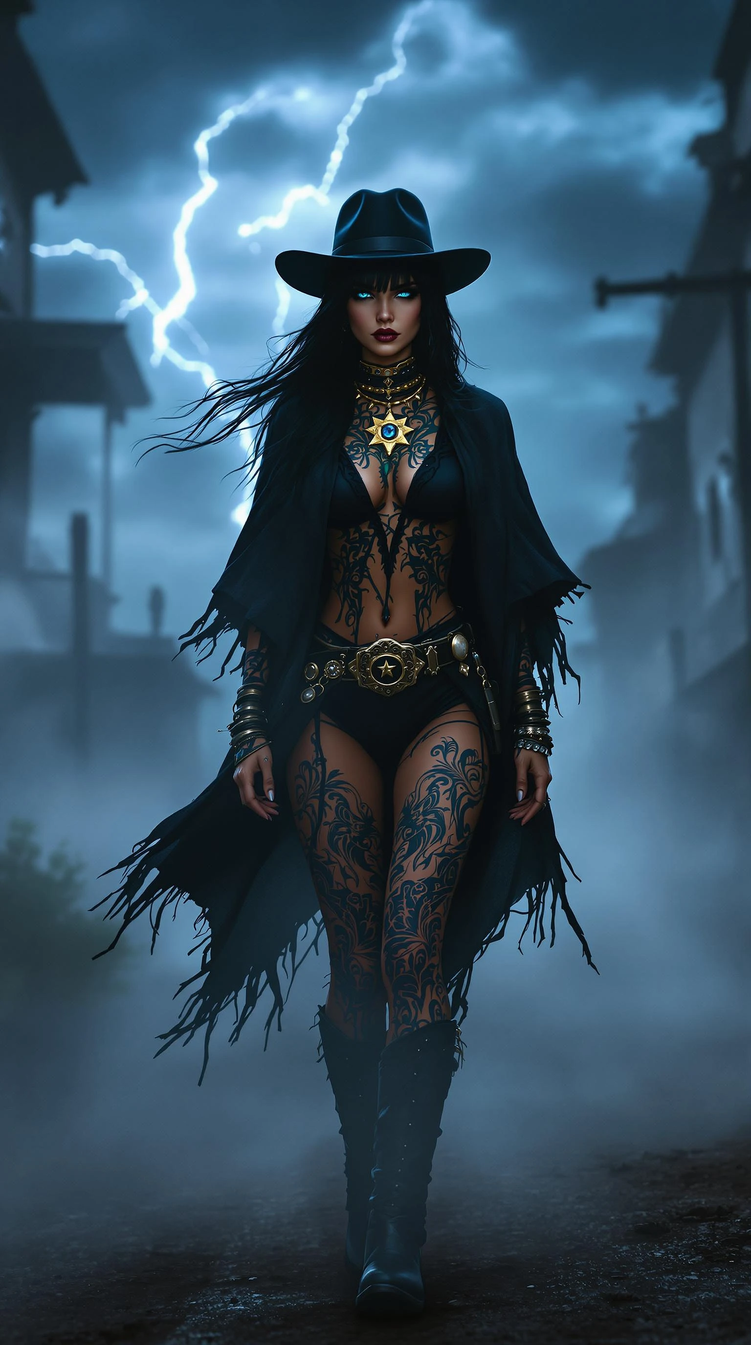 Hyper realistic, photo realism, High Contrast, insanely detailed and intricate, elegant, ornate, super detailed zoomed out full body HD Photo of beautiful, sultry female Spector of the murdered Sheriff, she walks the old west street in a very thick eerie fog. She walks in perfect silence with a confused expression on her face. She is almost transparent, she still wears her Sheriff's badge. She has colorful Native American tribal body tattoos, long black hair with bangs blowing in the wind, dark sapphire blue eyes framed by long, elegant eyelashes and ornate eyeshadow that compliments her eyes. She is wearing an ornate gold and onyx belt and choker, She wears a black flat top Stetson, the brim of her Stetson is level with her eyebrows. Clint Eastwood style poncho, and a ragged mini shirt, cowboy boots with silver spurs. It is night time, there are dark clouds moving in and a close bolt of lightning in the background. No poorly formed fingers, no extra arms, no extra legs, no extra fingers, no poorly formed hands, no poorly drawn body, no poorly drawn teeth, no bad anatomy.