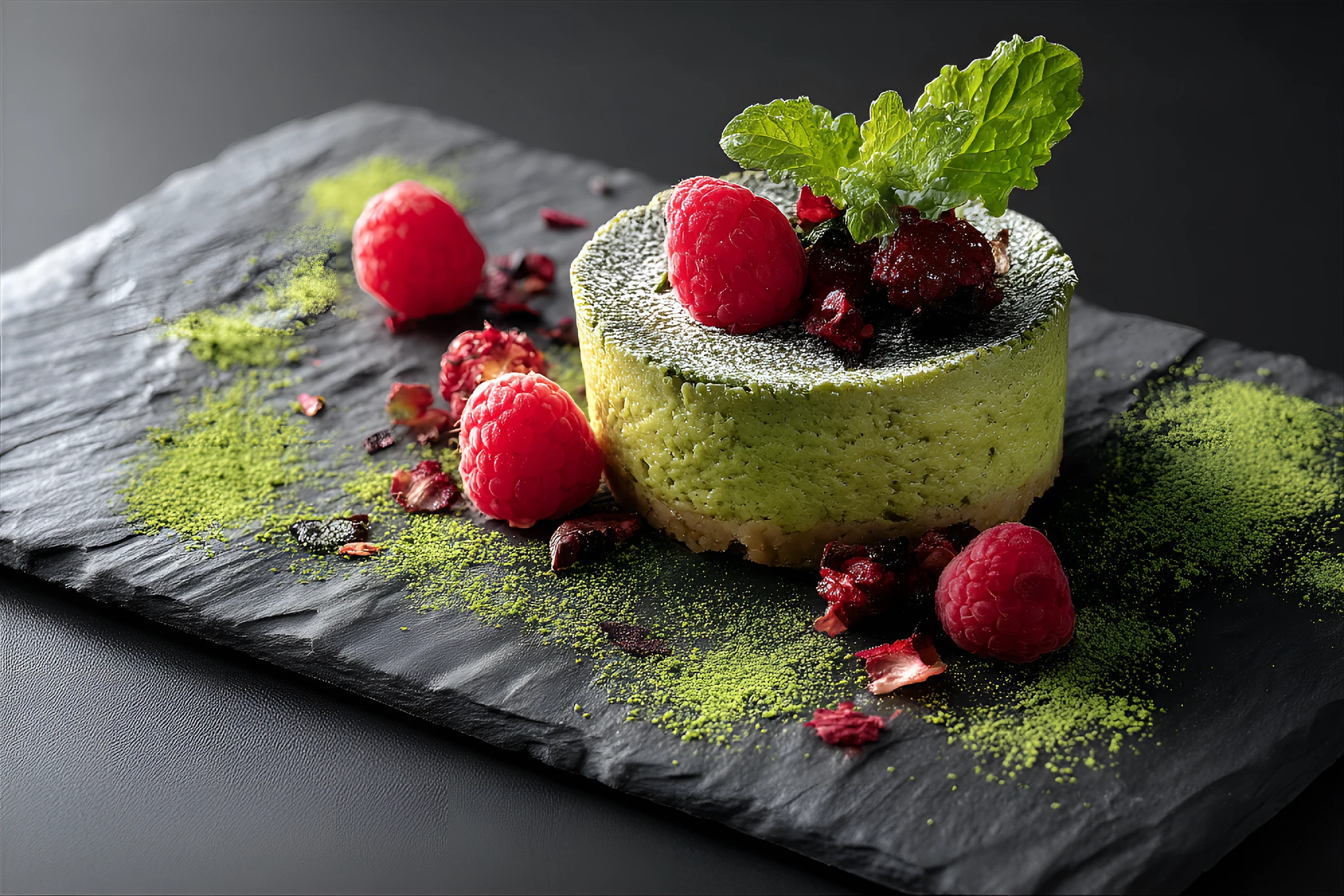 high-resolution top-down capture of a luxurious matcha-infused cheesecake on a minimalist slate platter, adorned with a delicate dusting of matcha powder and garnished with fresh raspberries