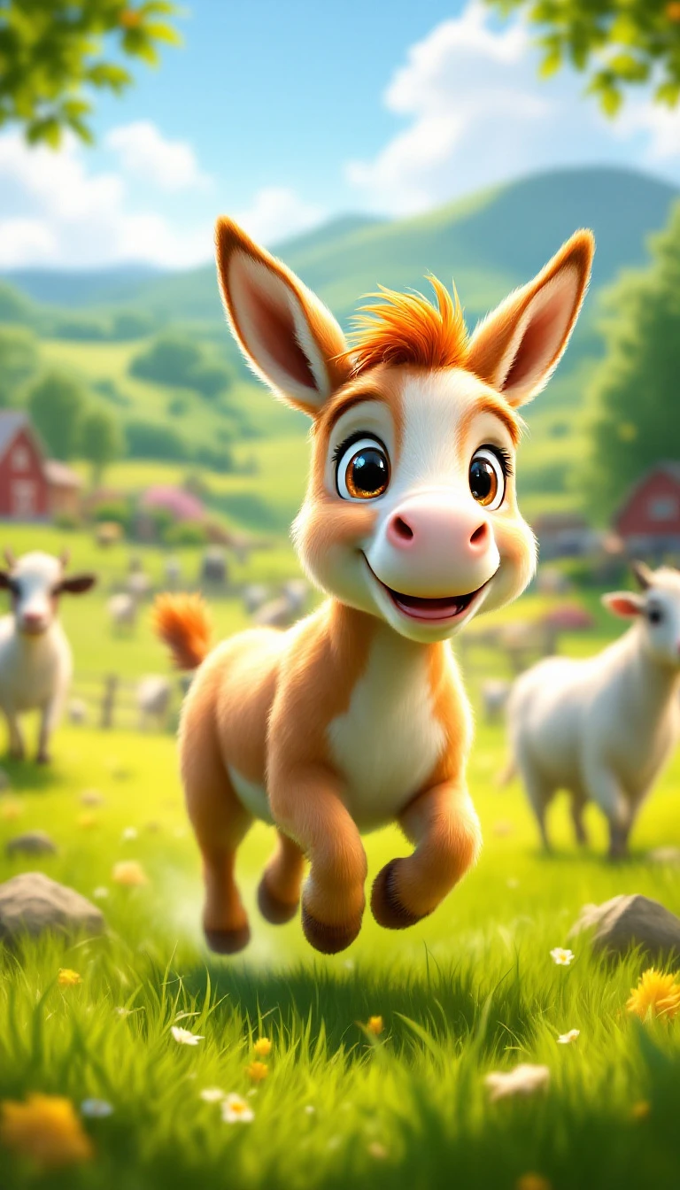 A cute, playful little donkey with soft orange and white fur, joyfully running and playing on a vibrant, lush green cattle farm. The donkey has big, curious eyes, perky ears, and a cheerful expression. The farm is filled with rich green grass, grazing cows and goats, and scattered haystacks. Bright sunlight shines over the landscape, casting gentle golden shadows. The sky is clear and blue with a few fluffy clouds. In the background, wooden fences, a red barn, and rolling green hills add depth to the scenery. The image should feel warm, happy, and full of life, with rich natural colors, high detail, soft textures, and a peaceful countryside vibe. Photorealistic style with high resolution.