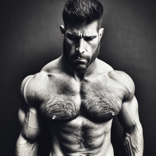 9:16 long shot wide angle photo of a rugged dark stubbled face Italian John Doe macho trucker extremely muscular entire body, very shot modern crew cut hair style, powerful looking, angry, oversized upper and lower pectoral muscle, beastly hairy all over, smoldering detailed eyes, D
