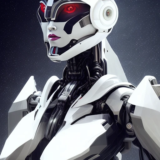 full portrait close-up, max epic, beautiful girl in streamlined Sci-fi exo costume, gorgeous dreamy face, black long hair, slender figure looking into the distance, glossy black silver max detailed insectoid Sci-fi mech, Sci-fi wings, insectoid style, style Tsutomu Nihei, style Akira, bright quasar light, outer space, dramatic background, volume graphics, anime art, manga drawing, space starlight, galaxy, plasma beams, 8k, UHD, graphics, anime, hyper-realistic, complex lighting, lighting effects --q 5 --ar 1:2