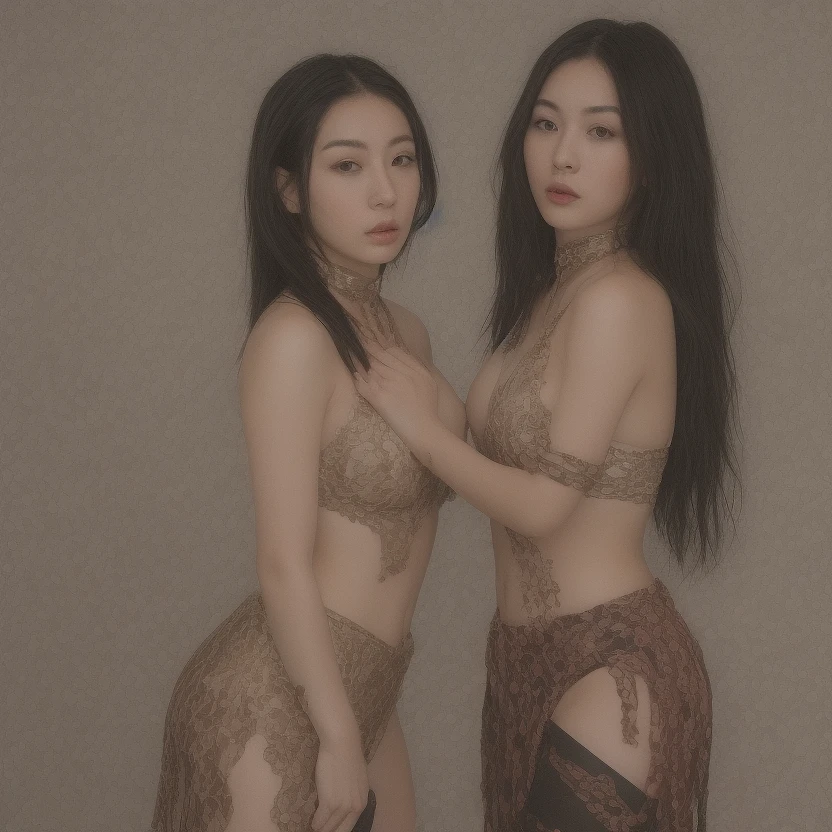 Two beautiful alluring Japanese women, kneel in a serene field of bleeding hearts, in an embrace, right hand of each on the other, facing one another, each with long jet black hair, black, gold and silver leather ornately detailed halter top and bottom embellished with red gemstones, steel black iron bands encircle each of their necks, wrists and ankles adding a touch of mystery. Exquisite, photorealistic face, precise cosmetic features. Stunning, detailed eyes. Full, luscious lips, radiant skin. Hip-length luscious black hair. cinematic, high detail, extreme details, masterpiece, detailed gorgeous face, Big chest, cosmetic textures, Realistic face, cosmetic features, highly Detailed face, Detailed eyes. 8k, sharp focus, cinematic lighting, highly detailed, breathtaking, photography, stunning environment, wide-angle,