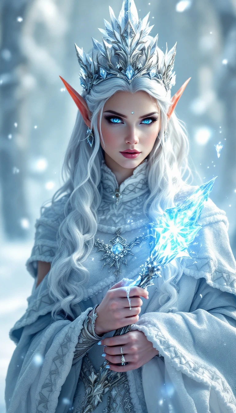 A regal elf queen with silver hair and piercing blue eyes, wearing an ornate crown of ice, holding a scepter that freezes the air around it, in the style of High Fantasy, exuding grace and authority. --ar 71:128 --stylize 750 --v 6
