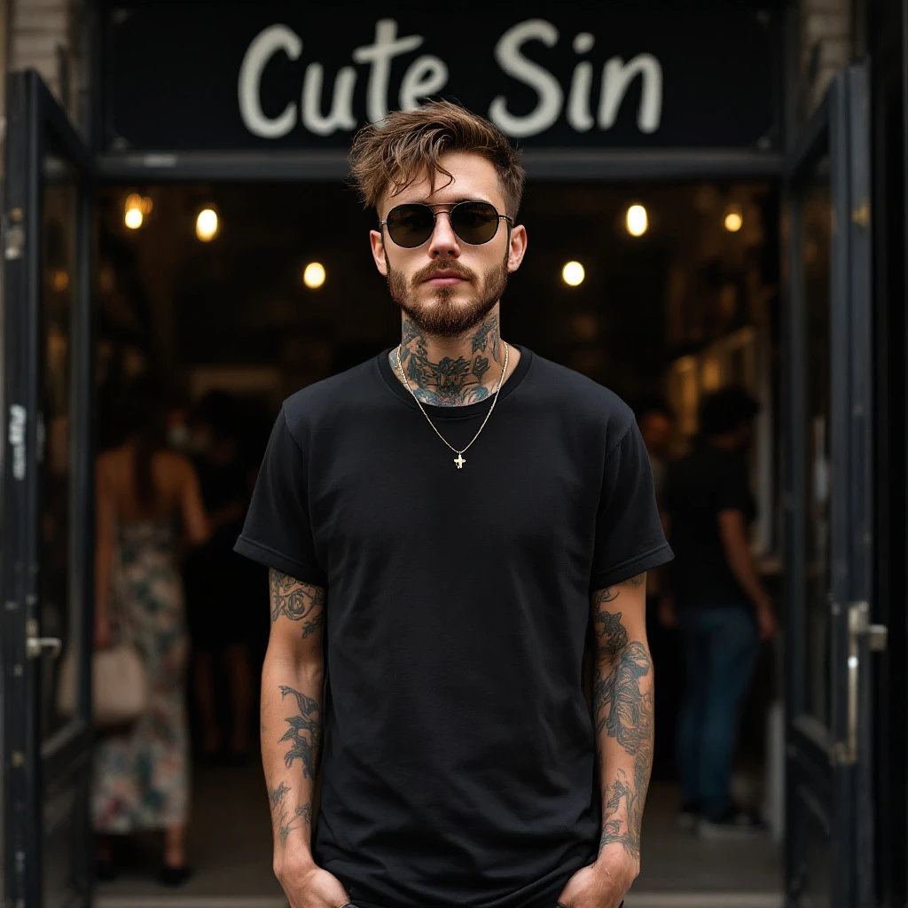 A young Caucasian woman with short brown hair, beard, wearing sunglasses and a black t-shirt, some tattoos, rock and roll style, standing in front of the Cute Sin Gallery in São Paulo, Brazil. with his hands in his pockets. Urban environment, some people in the background in the gallery. The photo should be frontal, highlighting the black t-shirt. He is not wearing any accessories. UHD --ar 9:16