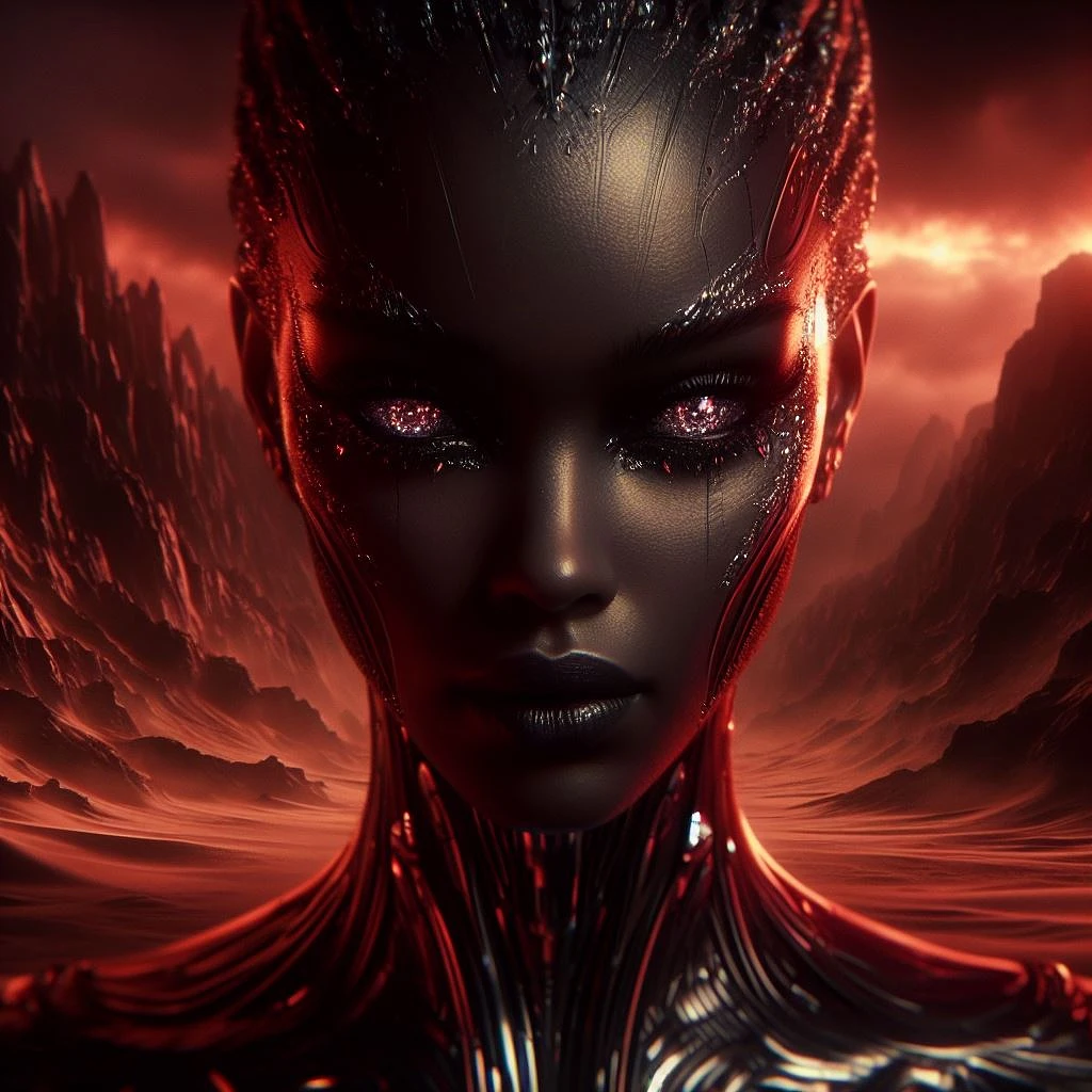In this portrait, Serqet stands in a dark and foreboding desert landscape, surrounded by towering sand dunes and an ominous red sky. She wears her Diamond skin, which glistens in the dim light, and her eyes seem to glow with a predatory intensity. The use of advanced 3D modeling and texturing techniques, combined with volumetric lighting and particle effects, create a breathtakingly realistic and immersive scene.