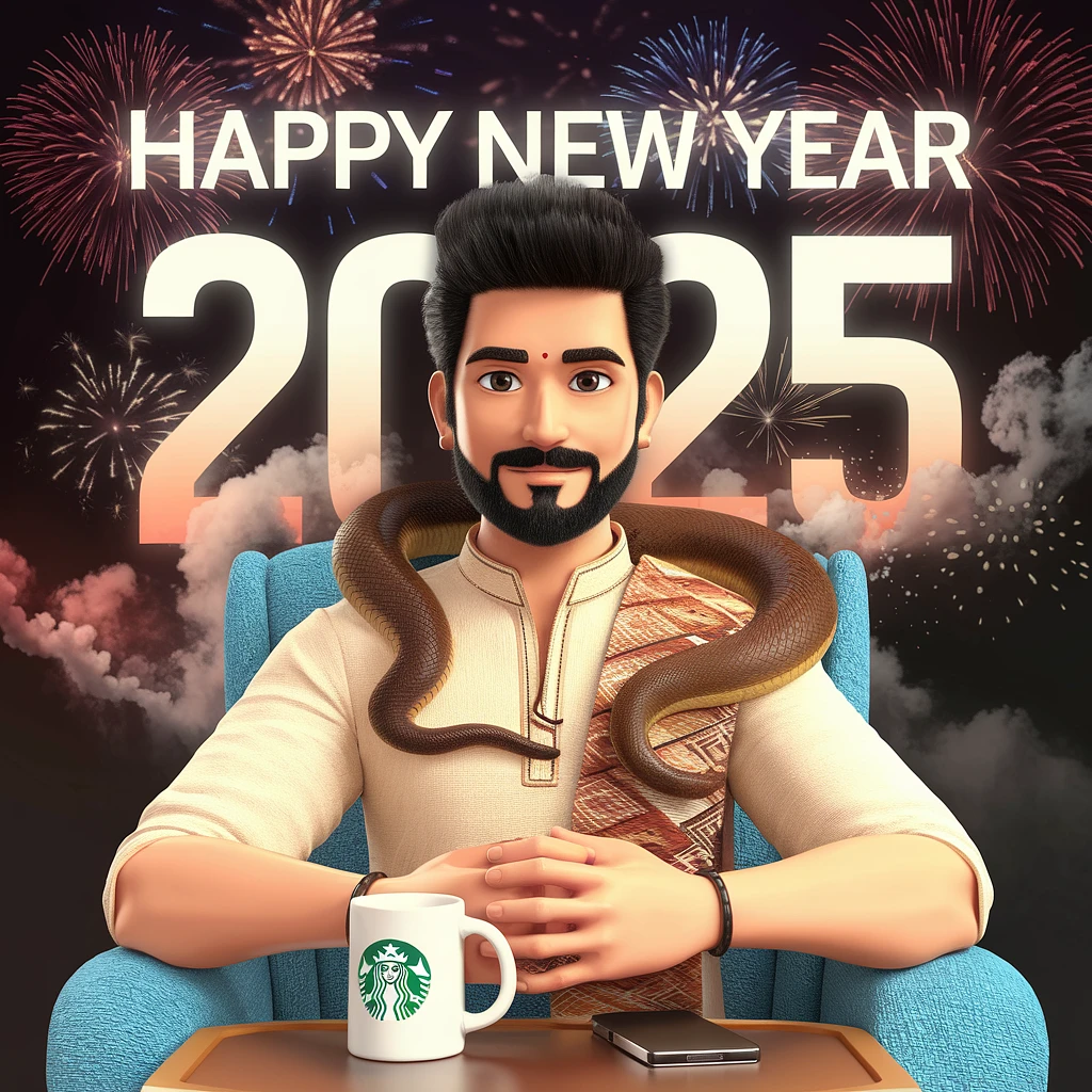 Anime 3D portrait image of a South Indian man with beard and mustache sitting on a chair looking directly into the viewer's eyes. A table was placed Infront of him and a Starbucks coffee mug placed on it and a mobile laying next to it. A brown pet snake was laying on his shoulder. Background has fireworks and smoke formed in a text accurately written "Happy New Year 2025".