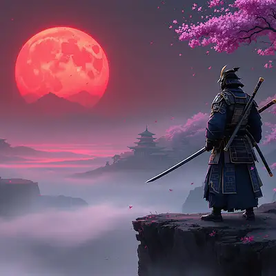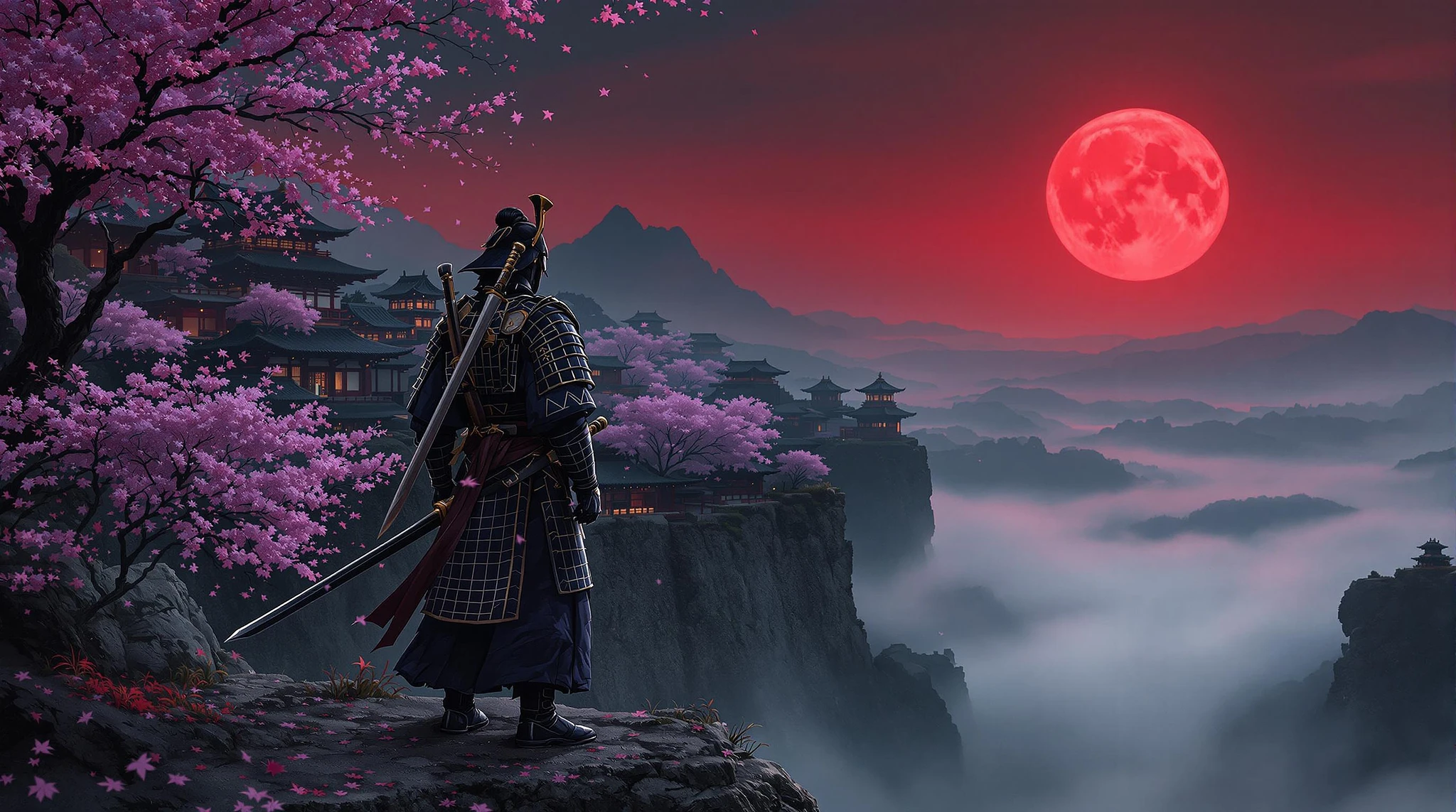 a portrait of an ancient Japanese samurai warrior holding his sword on his shoulder standing on a cliff looking into a far distance at Japanese architecture with purple blossoming trees around the buildings, samurai armor and head gear, purple leaves falling to the ground, looking away from the camera, red moon rising, semi dark red atmosphere, fog on the ground floor of the cliff covering the Samuri's feet, paint texture for the image, high quality, 4k resolution