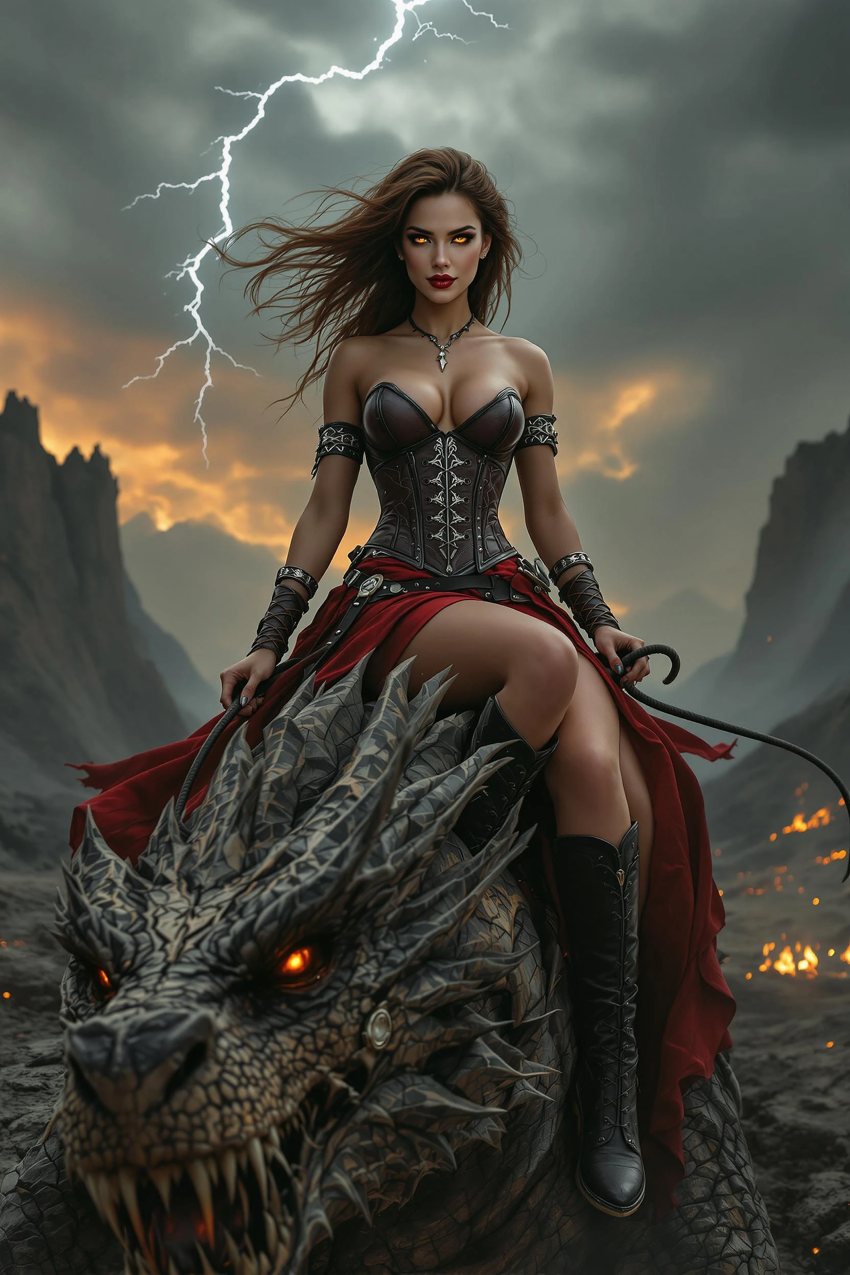 A woman who embodies boldness, audacity, and unrestrained energy stands as the focal point of a dramatic, high-stakes scene. Her striking figure is accentuated by a dark brown leather corset, intricately laced to highlight her slim waist and powerful posture. She wears a fiery red skirt with daring high slits on both sides, revealing her long, sculpted legs clad in sleek, knee-high black boots adorned with subtle metallic accents. Her wild, wind-swept hair flows like a tempest, framing her fierce expression and adding to her untamed, almost feral aura. Her full, crimson lips curve into a confident smirk, exuding both charm and danger. She rides atop a once-mighty dragon, now scarred and weathered, its scales bearing the marks of countless battles. The dragon moves slowly across a desolate, cracked landscape, its massive wings folded and its head bowed in reluctant submission. The saddle she sits on is crafted from dark, weathered leather, embellished with intricate silver engravings that glint faintly in the dim light. Despite its diminished glory, the dragon remains an imposing figure, its glowing amber eyes hinting at a lingering ferocity. The woman’s magnetic confidence radiates from her piercing eyes, which seem to hold the weight of countless adventures and unspoken stories. Her demeanor is a perfect blend of sharp wit, unyielding determination, and a fearless desire to push boundaries. She holds a coiled whip in one hand, its handle ornate and worn, while her other hand grips the reins with effortless authority. The atmosphere around her is charged with intensity, as though the very air crackles with her presence. The sky above is a tumultuous blend of stormy grays and fiery oranges, with lightning occasionally illuminating the scene. The ground beneath the dragon’s claws is a mix of ash and cracked earth, with faint embers glowing in the distance. In the background, the silhouettes of crumbling ruins and jagged mountains add to the sense of a world in decay, yet her presence injects it with life and defiance. Every detail is rendered in hyper-realistic detail, from the texture of her leather corset and the dragon’s weathered scales to the subtle play of light and shadow across the scene. The cinematic composition emphasizes her commanding presence, drawing the viewer’s gaze irresistibly to her. She is the embodiment of power, allure, and unapologetic individuality, a force of nature in a world that dares not stand in her way. Art style: Cinematic, hyper-realism, high detail, Octane Render, 8K resolution, dramatic lighting, dynamic composition.