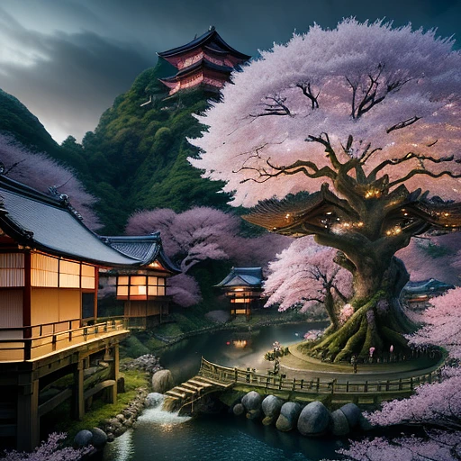 vast fantasy landscape with a giant cherry blossom tree, a suspended village is built on the tree, lots of fairy lights, high detail, japanese fantasy, rural japan, beautiful landscape, forests, mountains, waterfalls, rivers, lotr, dramatic lighting, high detail, intricate, high quality, 8k, high resolution, ultra realistic, --ar 16:9 --test