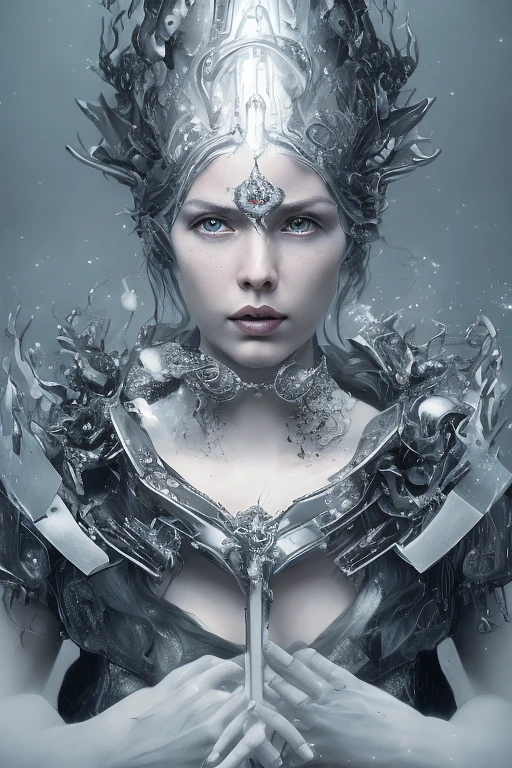 the girl is a magician, a girl of European appearance, with large gray expressive eyes with large black arrows, in a dark blue suit, holding a book over which a blue sphere is flying, on her head a beautiful large headdress with an ornament, works by the author: artgerm, Greg Rutkowski and Alphonse from the Fly, 8 thousand, real perfect female anatomy, over-detailed, epic cinematic, octane rendering, extremely high detail, post-processing, noise, increased beta, q 2, v 4