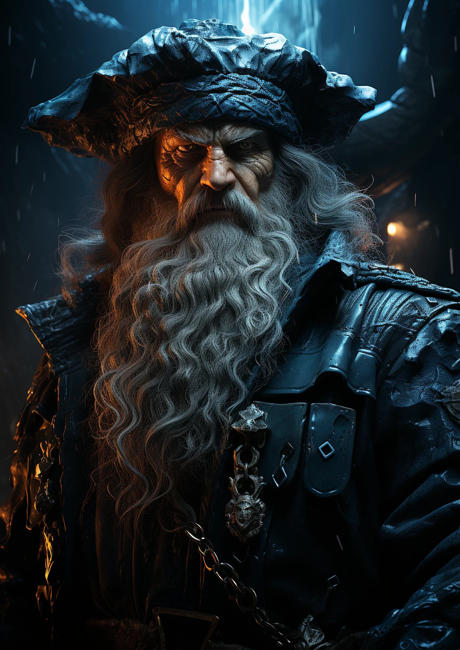 a fisherman in his blue sea, in the style of dark fantasy creatures, kushan empire, devilcore, intricate costumes, highly realistic, intel core, vibrant illustrations --ar 17:24 --s 750 --v 5. 2