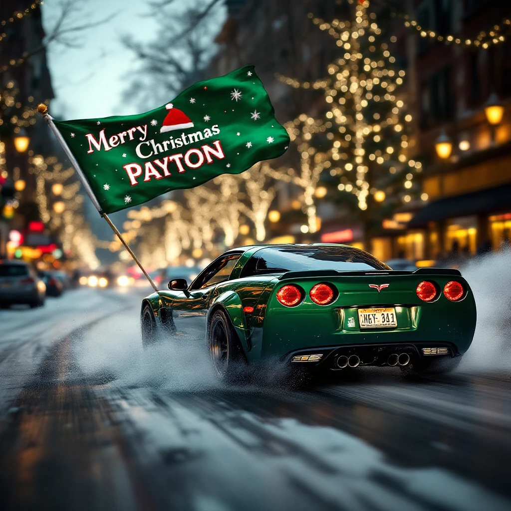 Create a cinematic and realistic image of a British racing green 2000 Corvette racing through the streets. The car should have a flag stick off the rear hatch with a festive Christmas flag displaying the message "Merry Christmas Payton" clearly. The streets should be bustling with holiday decorations and lights, and the background should be slightly blurred to emphasize the speed of the racing Corvette. Ensure high detail and ultra-realistic rendering to capture a dynamic, festive atmosphere.