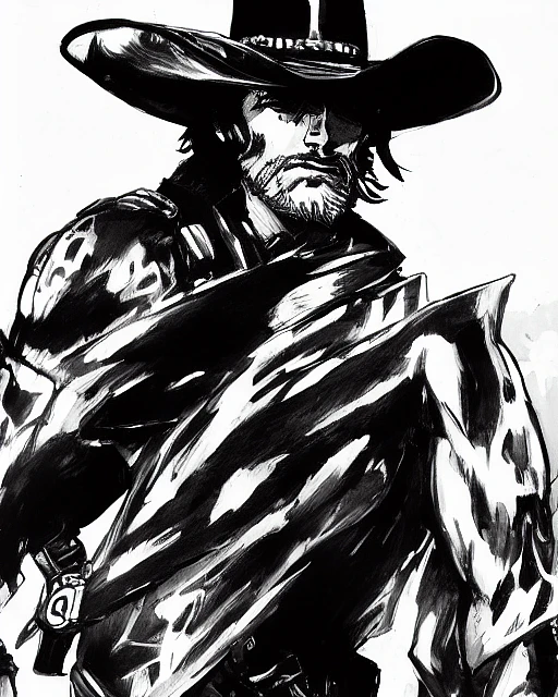 Drawing of Jessie McCree, black and white, concept art, sumi - e style, artstation, trending, highly detailed, smooth, focus, art by yoji shinkawa