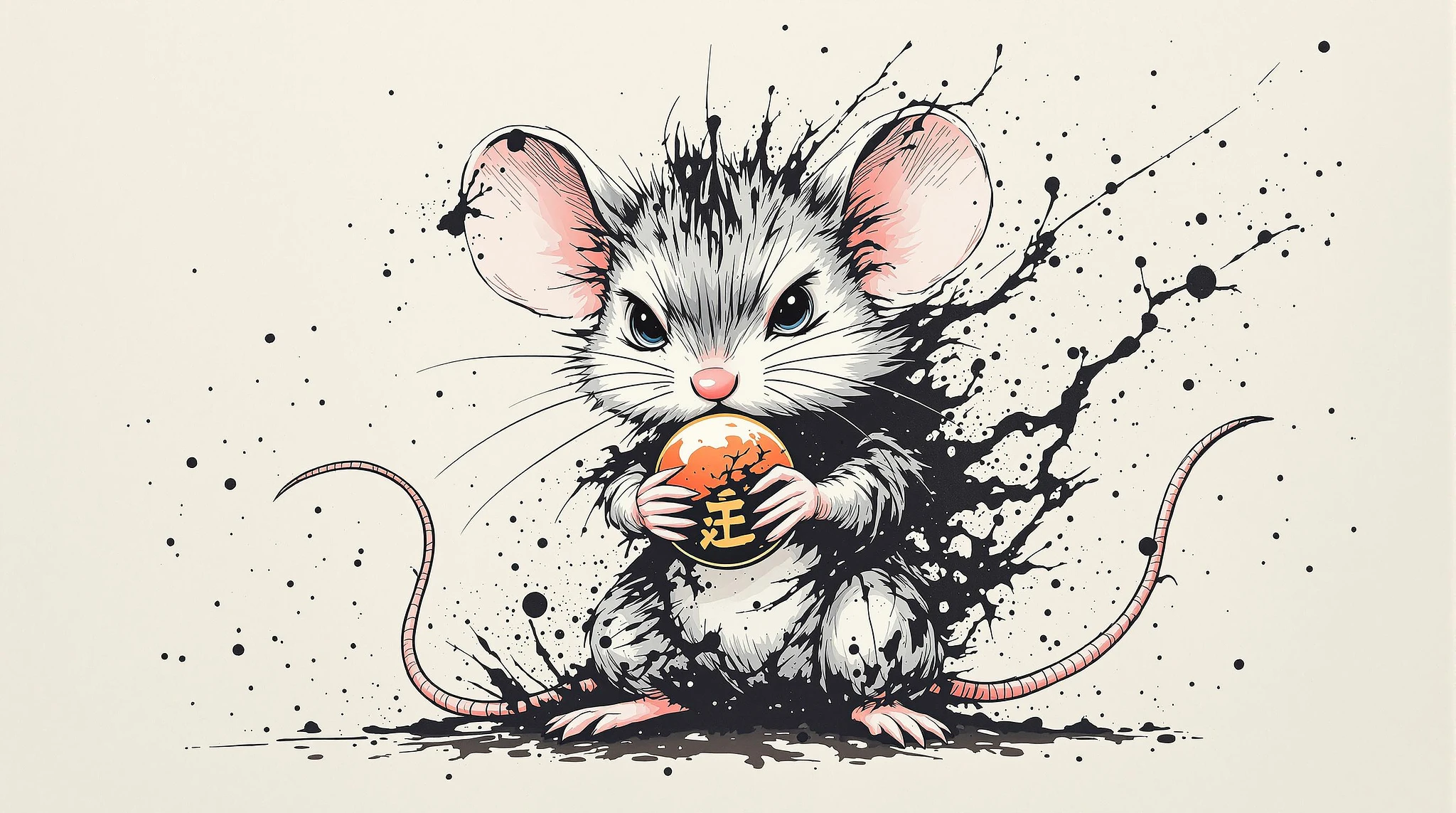 cute Mouse with straight face grabing a protective talisman, detailed, ink style, Ink splash art on the background, ink style, Ink wraps around the body, and the ink obscures the subject, exquisite poster