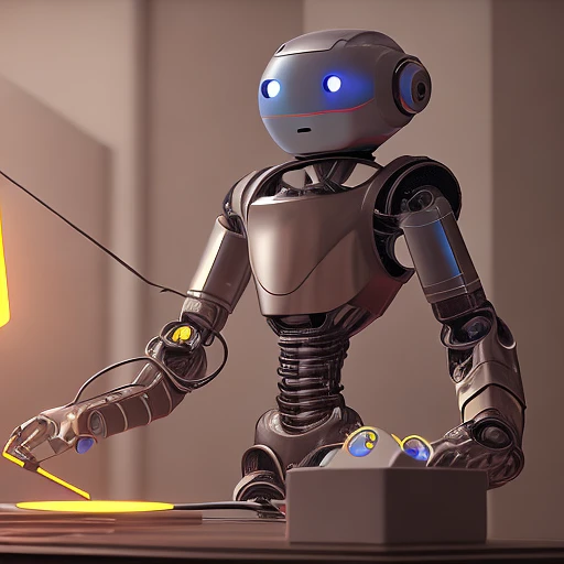 midjourney v4 style, a friendly robot sitting at a desk helping a humble man assemble a clock, hyper realistic, 8k, yellow lighting, intricate details