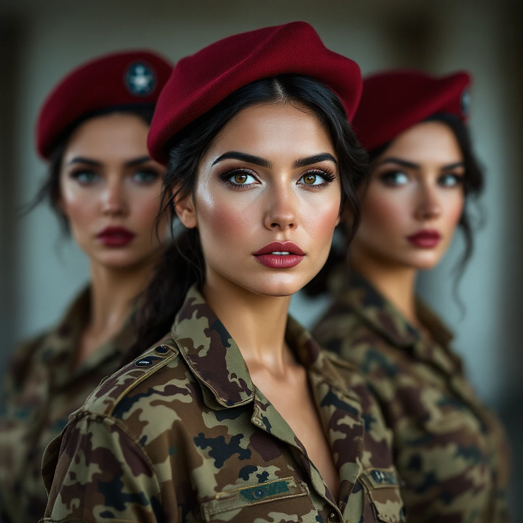 A full indoor shot of three women in camouflage military uniforms and red berets, standing in formation. Each woman has a unique facial structure and distinct features, emphasizing diversity while maintaining a cohesive military presence. The central woman is in sharp focus, her face and upper body clearly defined. She has a serious, determined expression, gazing slightly to the viewer’s right. Her dark hair is neatly pulled back into a ponytail, highlighting her sharp cheekbones and intense brown eyes. She wears subtle but noticeable makeup, with deep reddish-brown lips that add to her commanding presence. The two women beside her are slightly out of focus, adding depth and realism, but their distinct features remain visible. The woman on the left has high cheekbones, a strong jawline, and deep-set green eyes, with short dark-brown hair tucked under her beret. The woman on the right has a softer, rounder face with warm hazel eyes, and her dark, wavy hair is pulled into a low bun. Each wears an intricately detailed camouflage uniform in earthy browns, greens, and grays, signifying an elite military or paramilitary unit. Their red berets, adorned with unique insignias, suggest rank and affiliation. The lighting is soft and evenly distributed, ensuring natural skin tones and highlighting the realistic textures of their clothing and facial features. The setting is an official indoor military environment, possibly a briefing or ceremony. The background remains subtly blurred, keeping the focus on the three women while enhancing depth. Rendered in ultra-photorealistic detail, every aspect—from skin texture to fabric stitching—is meticulously depicted, creating an immersive, lifelike portrayal of these disciplined and diverse soldiers.