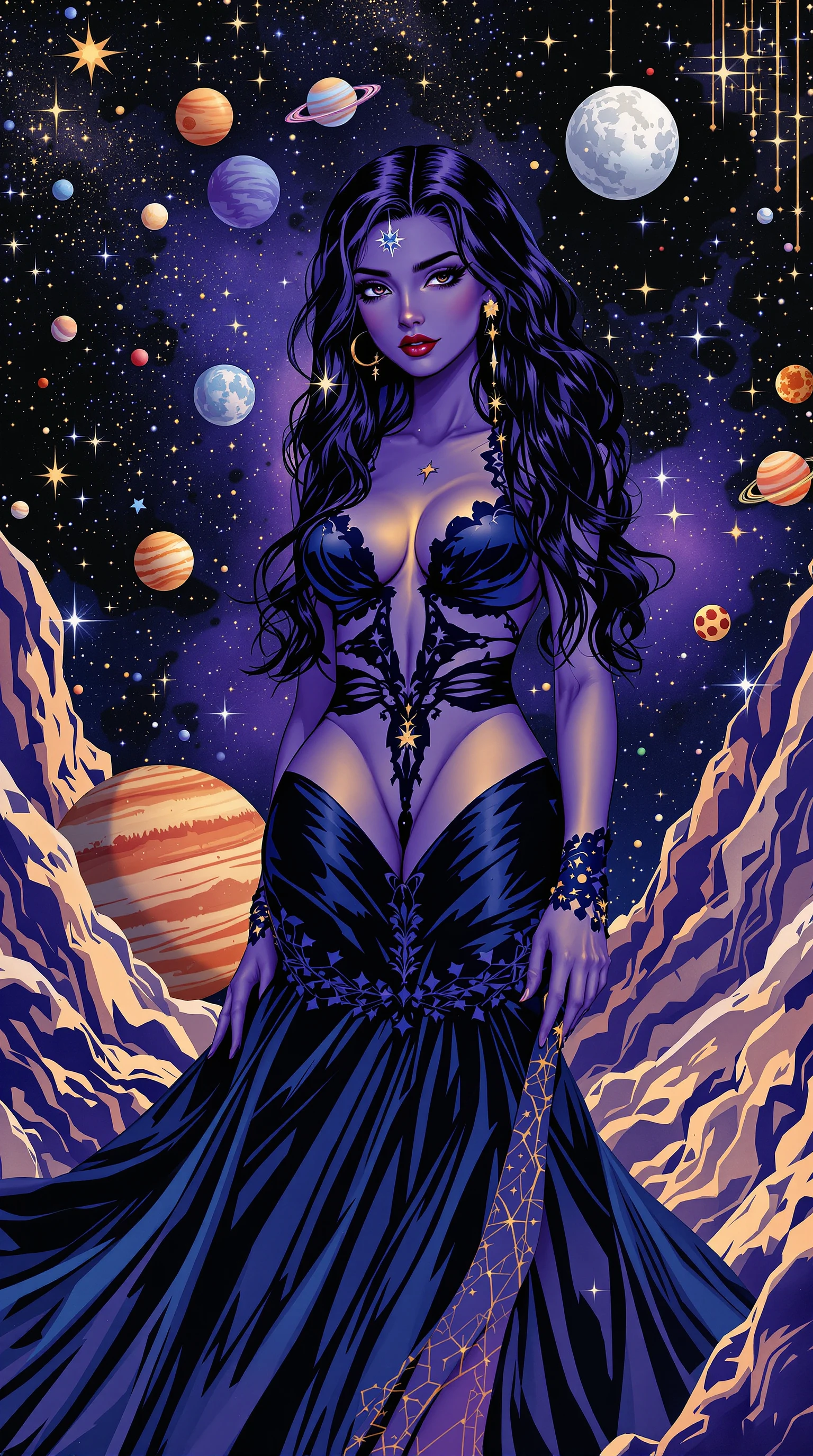 A photograph of a woman in a dark blue dress, a realistic comic cover, a space theme, an astrological theme, Pin -AP, a violet color scheme, where planets are sweets inspired by astrology, full - bodybuilding, lunar thematic clothing, illustrator of secret Magic environment, blue and black color scheme, 4k