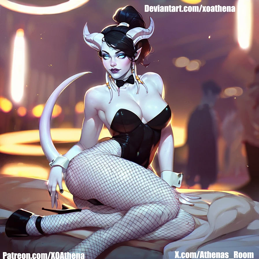 She took her place at the velvet-draped blackjack table, dressed in a midnight-black bunny suit that hugged every divine contour of her pale, sculpted body. Her curled horns glistened under the chandeliers, a mark of something… otherworldly.