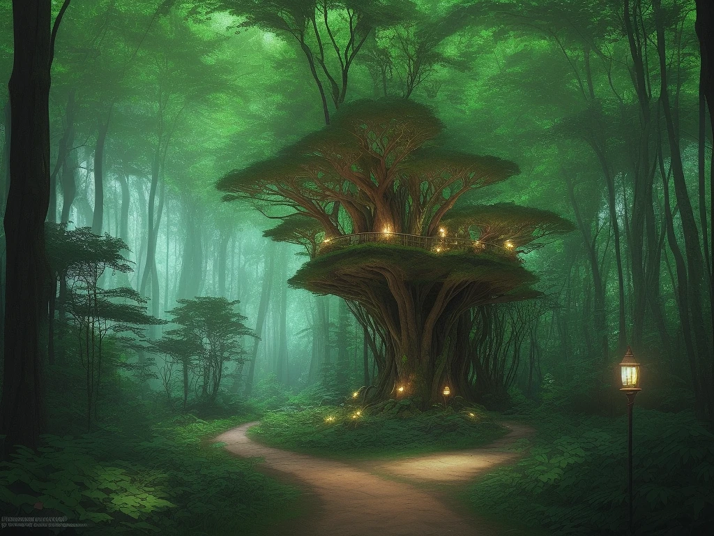 anishinaabe woodlands forrestscape, path, walkway, hidden in the forrest, forrestpunk, lush vegetation, vibrant colours, organic architecture growing out of giant trees, magnificent, sci fi concept art, magical, fantasy environment --ar 16:9 Night forest, a forest full of oak trees, magic forest, magic, with lights and a lot of magic, with the details of the trees ultra realistic, the magic preguinating the whole environment, magical animals in peace, stars and moon, a night magical forest to rest the body and mind, a mystical forest in 8k, vivid green leaves, and magical and shiny flowers, goblins walking all over the woods, all in 8k ultra hd realistic, dramatic light, pale sunrise, cinematic lighting, battered, low angle, trending on artstation, 4k, hyper realistic, focused, extreme details, unreal engine 5, cinematic, masterpiece, art by studio ghibli, intricate artwork by john william turner