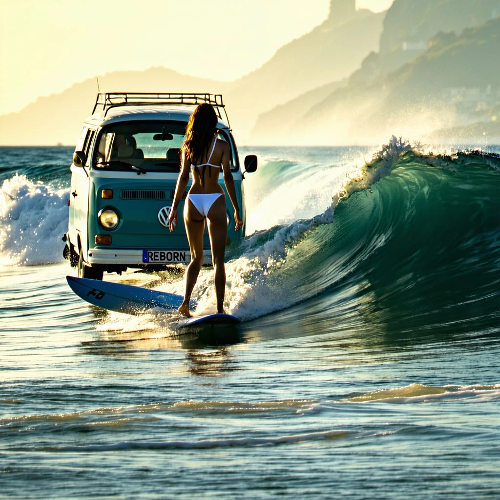 ULTRA HD 4k high realistic fashion image, photo full body shot of a young gorgeous Brazilian woman with a thin athletic physique in a white bikini, surfing on a blue surfboard down a monster breaking wave, backlit by the sun with a classic vw bus surfing beside her, with the word REBORN written in block letters on the license plate. . . Golden filtering light at sunset, ethereal lighting casting shadows down the face of the wave with rays of light streaming towards the viewer, and the image projecting a ghostlike feel of the 1960's surf scene